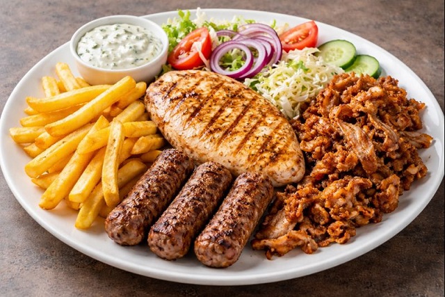 Gyros , Hähnchenbrustfilet , 3 x Cevapcici , Pommes , Reis dazu Krautsalat und Tsatsiki